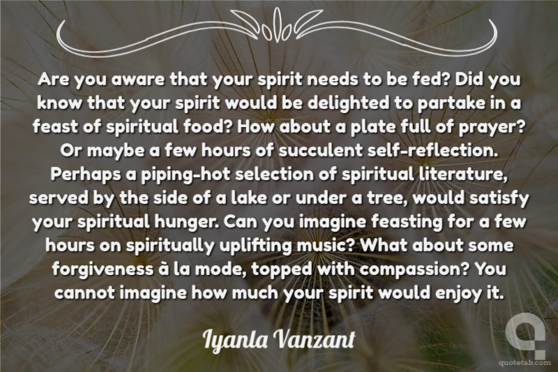Are you aware that your spirit needs to be fed? Did you know that your spirit would be delighted to partake in a feast of spiritual food? How about a plate full of prayer? Or maybe a few hours of succulent self-reflection. Perhaps a piping-hot selection of spiritual literature, served by the side of a lake or under a tree, would satisfy your spiritual hunger. Can you imagine feasting for a few hours on spiritually uplifting music? What about some forgiveness à la mode, topped with compassion? You cannot imagine how much your spirit would enjoy it.