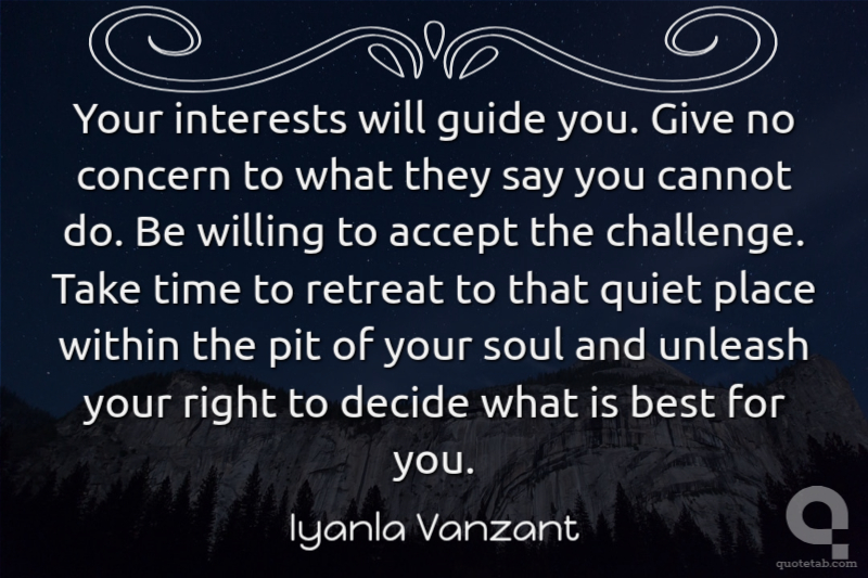 Your interests will guide you. Give no concern to what they say you cannot do. Be willing to accept the challenge. Take time to retreat to that quiet place within the pit of your soul and unleash your right to decide what is best for you.