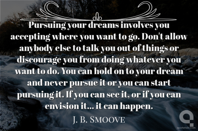 Pursuing your dreams involves you accepting where you want to go. Don't allow anybody else to talk you out of things or discourage you from doing whatever you want to do. You can hold on to your dream and never pursue it or you can start pursuing it. If you can see it, or if you can envision it... it can happen.