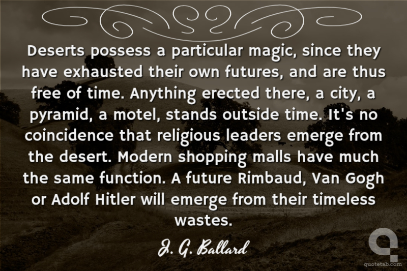 Deserts possess a particular magic, since they have exhausted their own futures, and are thus free of time. Anything erected there, a city, a pyramid, a motel, stands outside time. It's no coincidence that religious leaders emerge from the desert. Modern shopping malls have much the same function. A future Rimbaud, Van Gogh or Adolf Hitler will emerge from their timeless wastes.