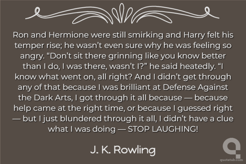 Ron and Hermione were still smirking and Harry felt his temper rise; he wasn’t even sure why he was feeling so angry. “Don’t sit there grinning like you know better than I do, I was there, wasn’t I?” he said heatedly. “I know what went on, all right? And I didn’t get through any of that because I was brilliant at Defense Against the Dark Arts, I got through it all because — because help came at the right time, or because I guessed right — but I just blundered through it all, I didn’t have a clue what I was doing — STOP LAUGHING!