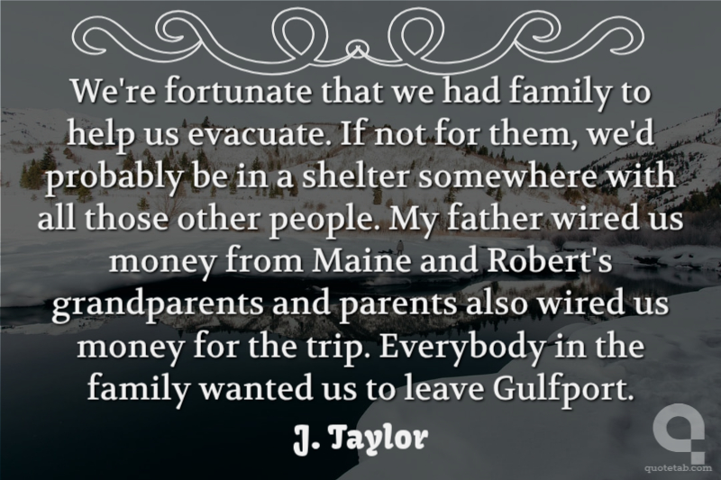 We're fortunate that we had family to help us evacuate. If not for them, we'd probably be in a shelter somewhere with all those other people. My father wired us money from Maine and Robert's grandparents and parents also wired us money for the trip. Everybody in the family wanted us to leave Gulfport.