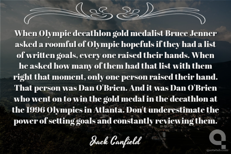 When Olympic decathlon gold medalist Bruce Jenner asked a roomful of Olympic hopefuls if they had a list of written goals, every one raised their hands. When he asked how many of them had that list with them right that moment, only one person raised their hand. That person was Dan O'Brien. And it was Dan O'Brien who went on to win the gold medal in the decathlon at the 1996 Olympics in Atlanta. Don't underestimate the power of setting goals and constantly reviewing them.