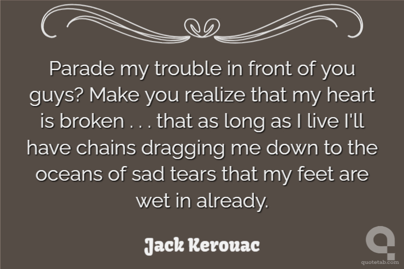 Parade my trouble in front of you guys? Make you realize that my heart is broken . . . that as long as I live I'll have chains dragging me down to the oceans of sad tears that my feet are wet in already.