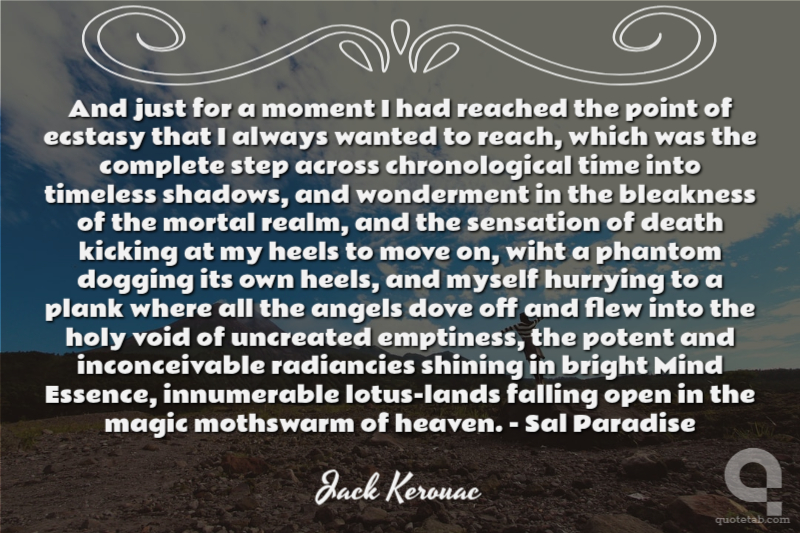 And just for a moment I had reached the point of ecstasy that I always wanted to reach, which was the complete step across chronological time into timeless shadows, and wonderment in the bleakness of the mortal realm, and the sensation of death kicking at my heels to move on, wiht a phantom dogging its own heels, and myself hurrying to a plank where all the angels dove off and flew into the holy void of uncreated emptiness, the potent and inconceivable radiancies shining in bright Mind Essence, innumerable lotus-lands falling open in the magic mothswarm of heaven. - Sal Paradise