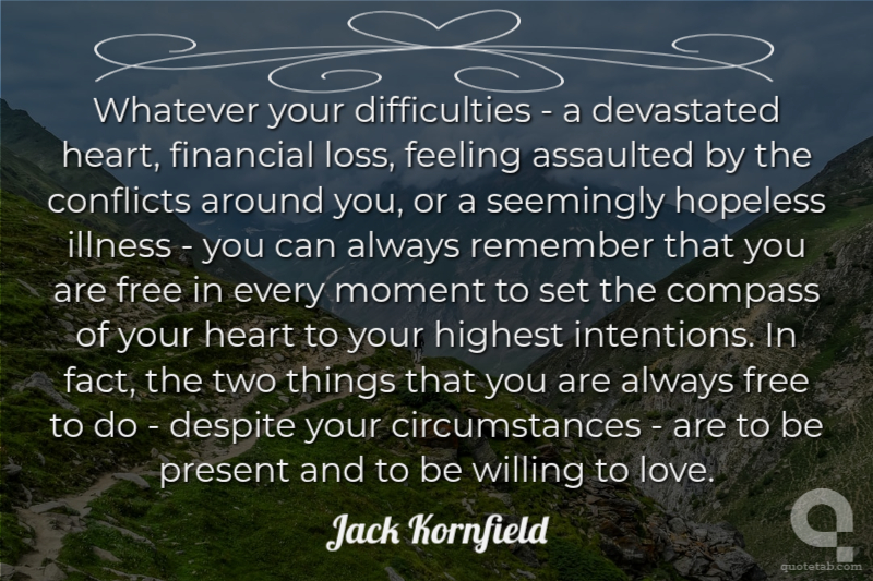 Whatever your difficulties - a devastated heart, financial loss, feeling assaulted by the conflicts around you, or a seemingly hopeless illness - you can always remember that you are free in every moment to set the compass of your heart to your highest intentions. In fact, the two things that you are always free to do - despite your circumstances - are to be present and to be willing to love.