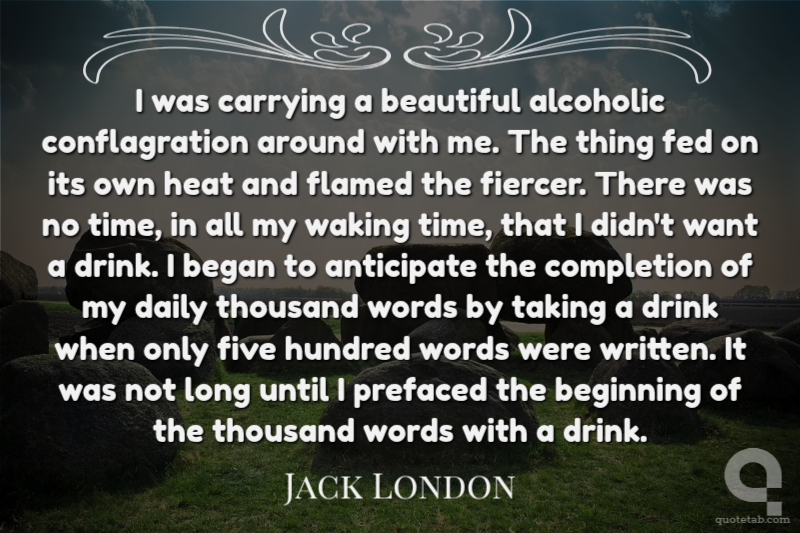 I was carrying a beautiful alcoholic conflagration around with me. The thing fed on its own heat and flamed the fiercer. There was no time, in all my waking time, that I didn't want a drink. I began to anticipate the completion of my daily thousand words by taking a drink when only five hundred words were written. It was not long until I prefaced the beginning of the thousand words with a drink.