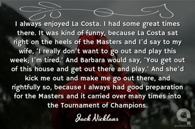 I always enjoyed La Costa. I had some great times there. It was kind of funny, because La Costa sat right on the heels of the Masters and I'd say to my wife, 'I really don't want to go out and play this week; I'm tired.' And Barbara would say, 'You get out of this house and get out there and play.' And she'd kick me out and make me go out there, and rightfully so, because I always had good preparation for the Masters and it carried over many times into the Tournament of Champions.