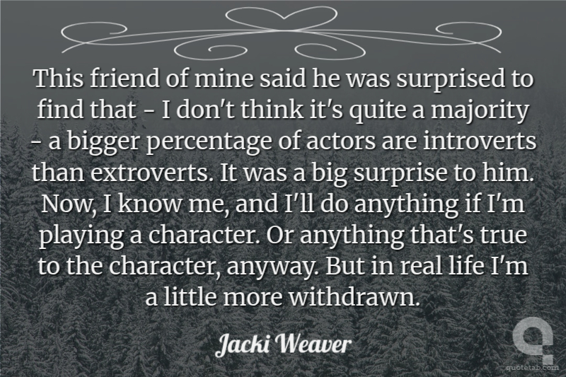 This friend of mine said he was surprised to find that - I don't think it's quite a majority - a bigger percentage of actors are introverts than extroverts. It was a big surprise to him. Now, I know me, and I'll do anything if I'm playing a character. Or anything that's true to the character, anyway. But in real life I'm a little more withdrawn.
