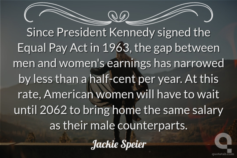 Since President Kennedy signed the Equal Pay Act in 1963, the gap between men and women's earnings has narrowed by less than a half-cent per year. At this rate, American women will have to wait until 2062 to bring home the same salary as their male counterparts.
