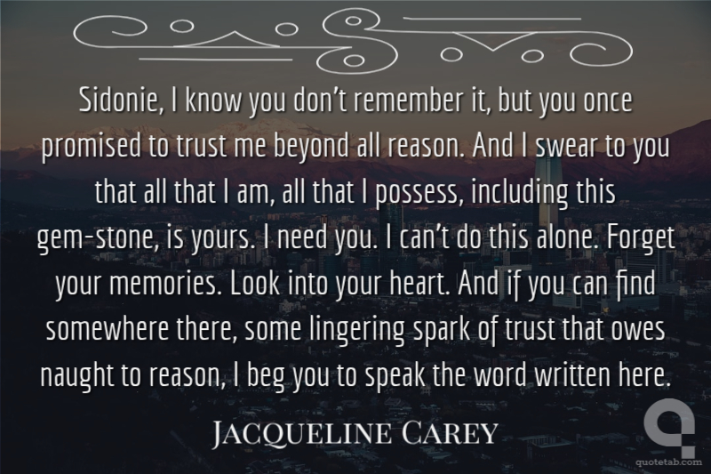 Sidonie, I know you don't remember it, but you once promised to trust me beyond all reason. And I swear to you that all that I am, all that I possess, including this gem-stone, is yours. I need you. I can't do this alone. Forget your memories. Look into your heart. And if you can find somewhere there, some lingering spark of trust that owes naught to reason, I beg you to speak the word written here.