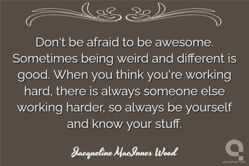 Don't be afraid to be awesome. Sometimes being weird and different is good. When you think you're working hard, there is always someone else working harder, so always be yourself and know your stuff.