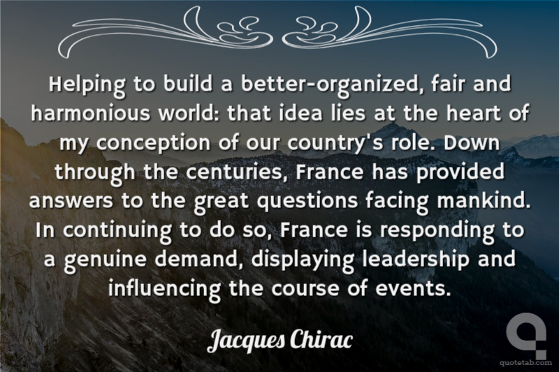 Helping to build a better-organized, fair and harmonious world: that idea lies at the heart of my conception of our country's role. Down through the centuries, France has provided answers to the great questions facing mankind. In continuing to do so, France is responding to a genuine demand, displaying leadership and influencing the course of events.