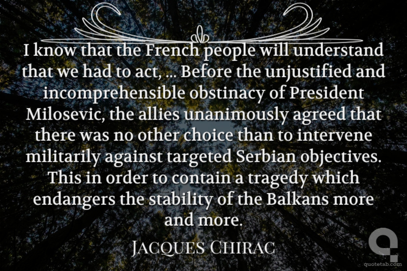 I know that the French people will understand that we had to act, ... Before the unjustified and incomprehensible obstinacy of President Milosevic, the allies unanimously agreed that there was no other choice than to intervene militarily against targeted Serbian objectives. This in order to contain a tragedy which endangers the stability of the Balkans more and more.