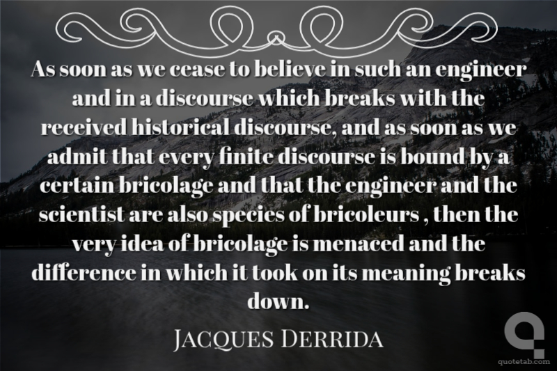 As soon as we cease to believe in such an engineer and in a discourse which breaks with the received historical discourse, and as soon as we admit that every finite discourse is bound by a certain bricolage and that the engineer and the scientist are also species of bricoleurs , then the very idea of bricolage is menaced and the difference in which it took on its meaning breaks down.