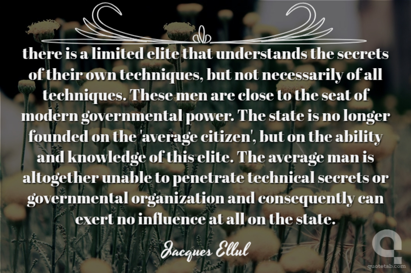 there is a limited elite that understands the secrets of their own techniques, but not necessarily of all techniques. These men are close to the seat of modern governmental power. The state is no longer founded on the 'average citizen', but on the ability and knowledge of this elite. The average man is altogether unable to penetrate technical secrets or governmental organization and consequently can exert no influence at all on the state.