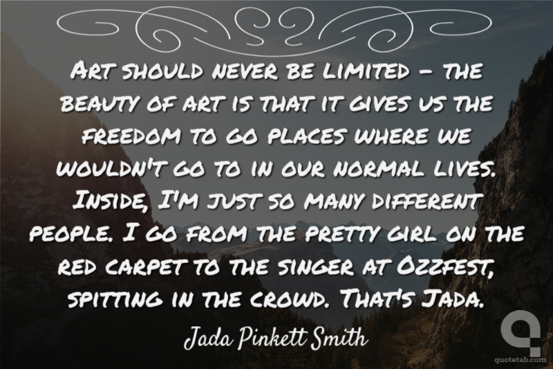 Art should never be limited - the beauty of art is that it gives us the freedom to go places where we wouldn't go to in our normal lives. Inside, I'm just so many different people. I go from the pretty girl on the red carpet to the singer at Ozzfest, spitting in the crowd. That's Jada.