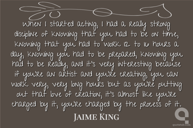 When I started acting, I had a really strong discipline of knowing that you had to be on time, knowing that you had to work 12 to 16 hours a day, knowing you had to be prepared, knowing you had to be ready, and it's very interesting because if you're an artist and you're creating, you can work very, very long hours but as you're putting out that love of creation, it's almost like you're charged by it, you're charged by the process of it.