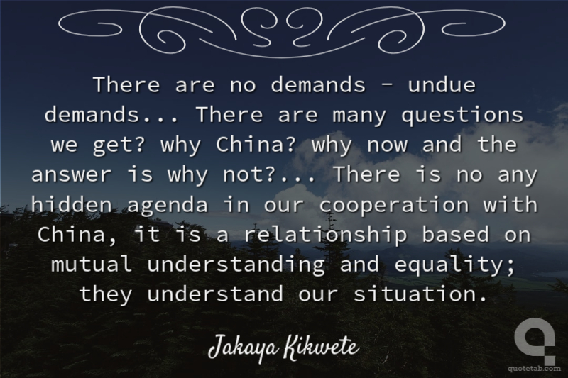 There are no demands - undue demands... There are many questions we get? why China? why now and the answer is why not?... There is no any hidden agenda in our cooperation with China, it is a relationship based on mutual understanding and equality; they understand our situation.