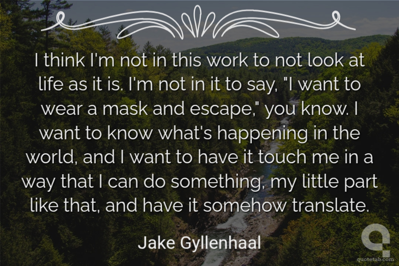 I think I'm not in this work to not look at life as it is. I'm not in it to say, "I want to wear a mask and escape," you know. I want to know what's happening in the world, and I want to have it touch me in a way that I can do something, my little part like that, and have it somehow translate.