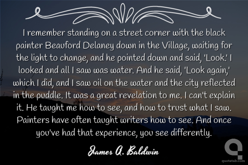 I remember standing on a street corner with the black painter Beauford Delaney down in the Village, waiting for the light to change, and he pointed down and said, 'Look.' I looked and all I saw was water. And he said, 'Look again,' which I did, and I saw oil on the water and the city reflected in the puddle. It was a great revelation to me. I can't explain it. He taught me how to see, and how to trust what I saw. Painters have often taught writers how to see. And once you've had that experience, you see differently.
