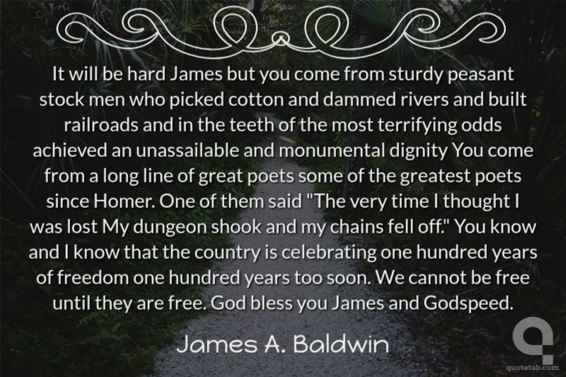 It will be hard James but you come from sturdy peasant stock men who picked cotton and dammed rivers and built railroads and in the teeth of the most terrifying odds achieved an unassailable and monumental dignity You come from a long line of great poets some of the greatest poets since Homer. One of them said "The very time I thought I was lost My dungeon shook and my chains fell off." You know and I know that the country is celebrating one hundred years of freedom one hundred years too soon. We cannot be free until they are free. God bless you James and Godspeed.
