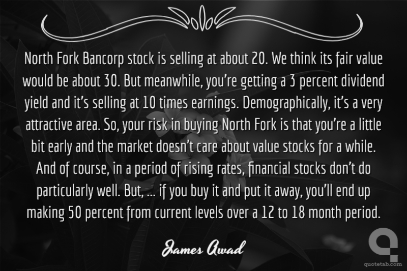 North Fork Bancorp stock is selling at about 20. We think its fair value would be about 30. But meanwhile, you're getting a 3 percent dividend yield and it's selling at 10 times earnings. Demographically, it's a very attractive area. So, your risk in buying North Fork is that you're a little bit early and the market doesn't care about value stocks for a while. And of course, in a period of rising rates, financial stocks don't do particularly well. But, ... if you buy it and put it away, you'll end up making 50 percent from current levels over a 12 to 18 month period.