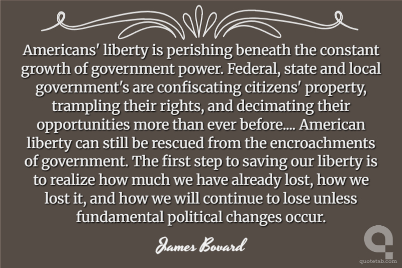 Americans' liberty is perishing beneath the constant growth of government power. Federal, state and local government's are confiscating citizens' property, trampling their rights, and decimating their opportunities more than ever before.... American liberty can still be rescued from the encroachments of government. The first step to saving our liberty is to realize how much we have already lost, how we lost it, and how we will continue to lose unless fundamental political changes occur.