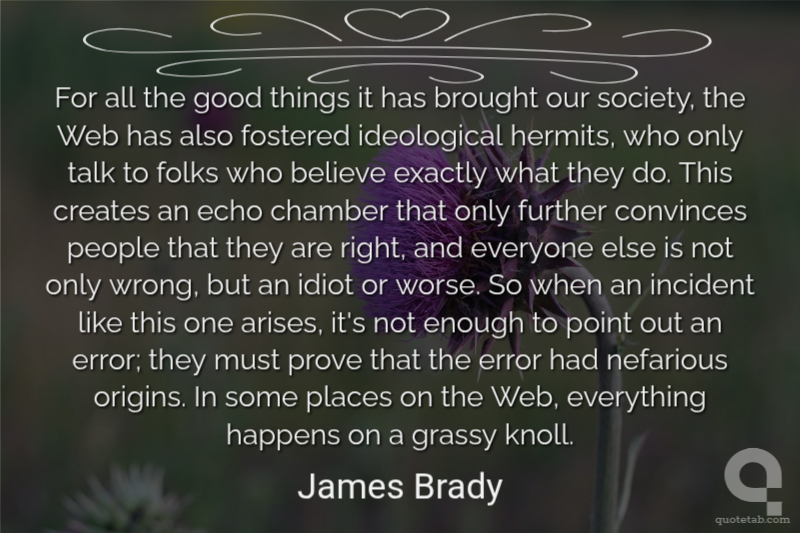 For all the good things it has brought our society, the Web has also fostered ideological hermits, who only talk to folks who believe exactly what they do. This creates an echo chamber that only further convinces people that they are right, and everyone else is not only wrong, but an idiot or worse. So when an incident like this one arises, it's not enough to point out an error; they must prove that the error had nefarious origins. In some places on the Web, everything happens on a grassy knoll.