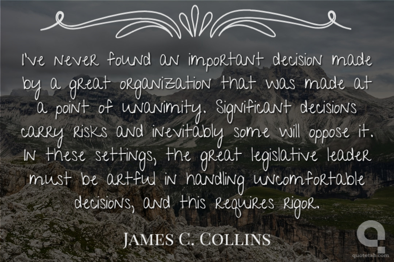 I've never found an important decision made by a great organization that was made at a point of unanimity. Significant decisions carry risks and inevitably some will oppose it. In these settings, the great legislative leader must be artful in handling uncomfortable decisions, and this requires rigor.