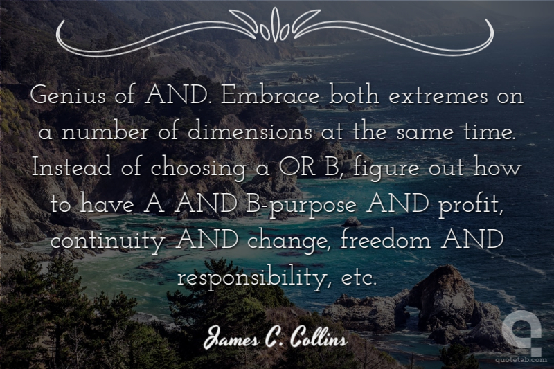 Genius of AND. Embrace both extremes on a number of dimensions at the same time. Instead of choosing a OR B, figure out how to have A AND B-purpose AND profit, continuity AND change, freedom AND responsibility, etc.