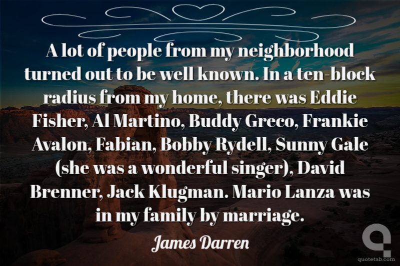 A lot of people from my neighborhood turned out to be well known. In a ten-block radius from my home, there was Eddie Fisher, Al Martino, Buddy Greco, Frankie Avalon, Fabian, Bobby Rydell, Sunny Gale (she was a wonderful singer), David Brenner, Jack Klugman. Mario Lanza was in my family by marriage.