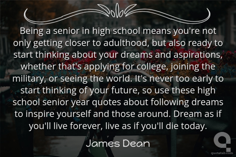 Being a senior in high school means you're not only getting closer to adulthood, but also ready to start thinking about your dreams and aspirations, whether that's applying for college, joining the military, or seeing the world. It's never too early to start thinking of your future, so use these high school senior year quotes about following dreams to inspire yourself and those around. Dream as if you'll live forever, live as if you'll die today.