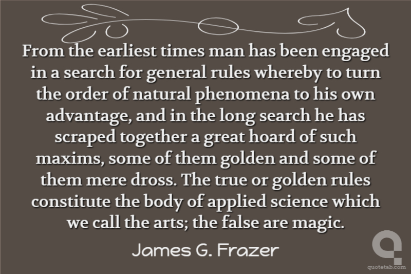 From the earliest times man has been engaged in a search for general rules whereby to turn the order of natural phenomena to his own advantage, and in the long search he has scraped together a great hoard of such maxims, some of them golden and some of them mere dross. The true or golden rules constitute the body of applied science which we call the arts; the false are magic.