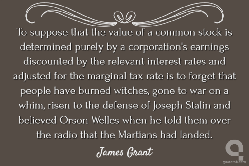To suppose that the value of a common stock is determined purely by a corporation's earnings discounted by the relevant interest rates and adjusted for the marginal tax rate is to forget that people have burned witches, gone to war on a whim, risen to the defense of Joseph Stalin and believed Orson Welles when he told them over the radio that the Martians had landed.