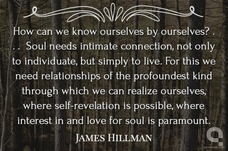 How can we know ourselves by ourselves? . . . Soul needs intimate connection, not only to individuate, but simply to live. For this we need relationships of the profoundest kind through which we can realize ourselves, where self-revelation is possible, where interest in and love for soul is paramount.