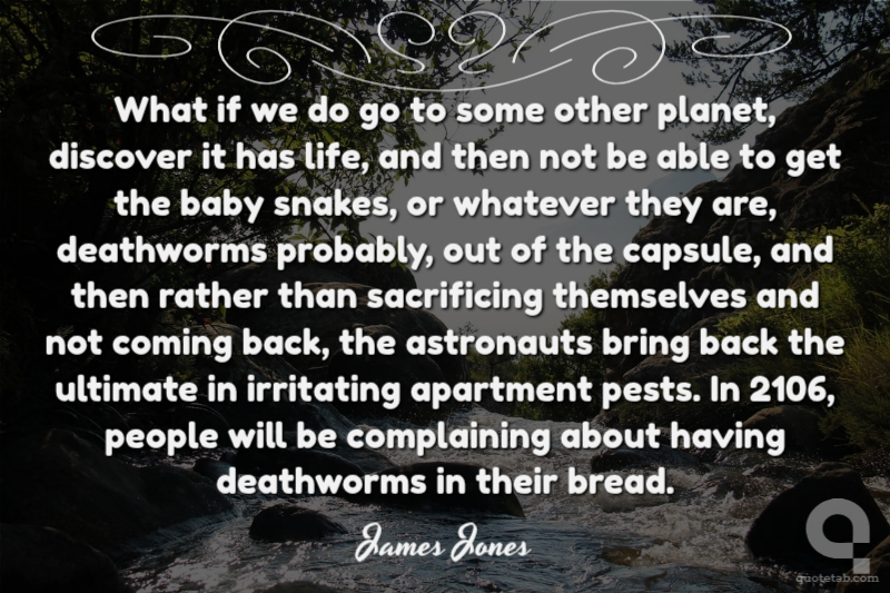 What if we do go to some other planet, discover it has life, and then not be able to get the baby snakes, or whatever they are, deathworms probably, out of the capsule, and then rather than sacrificing themselves and not coming back, the astronauts bring back the ultimate in irritating apartment pests. In 2106, people will be complaining about having deathworms in their bread.