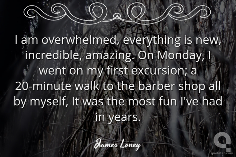 I am overwhelmed, everything is new, incredible, amazing. On Monday, I went on my first excursion; a 20-minute walk to the barber shop all by myself, It was the most fun I've had in years.