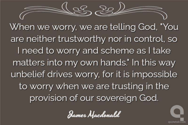 When we worry, we are telling God, "You are neither trustworthy nor in control, so I need to worry and scheme as I take matters into my own hands." In this way unbelief drives worry, for it is impossible to worry when we are trusting in the provision of our sovereign God.