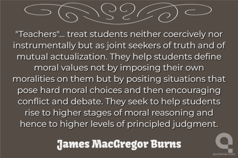"Teachers"... treat students neither coercively nor instrumentally but as joint seekers of truth and of mutual actualization. They help students define moral values not by imposing their own moralities on them but by positing situations that pose hard moral choices and then encouraging conflict and debate. They seek to help students rise to higher stages of moral reasoning and hence to higher levels of principled judgment.