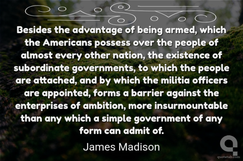 Besides the advantage of being armed, which the Americans possess over the people of almost every other nation, the existence of subordinate governments, to which the people are attached, and by which the militia officers are appointed, forms a barrier against the enterprises of ambition, more insurmountable than any which a simple government of any form can admit of.