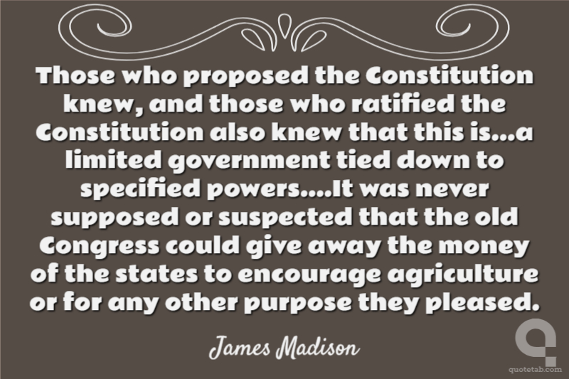 Those who proposed the Constitution knew, and those who ratified the Constitution also knew that this is...a limited government tied down to specified powers....It was never supposed or suspected that the old Congress could give away the money of the states to encourage agriculture or for any other purpose they pleased.