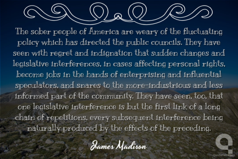 The sober people of America are weary of the fluctuating policy which has directed the public councils. They have seen with regret and indignation that sudden changes and legislative interferences, in cases affecting personal rights, become jobs in the hands of enterprising and influential speculators, and snares to the more-industrious and less informed part of the community. They have seen, too, that one legislative interference is but the first link of a long chain of repetitions, every subsequent interference being naturally produced by the effects of the preceding.