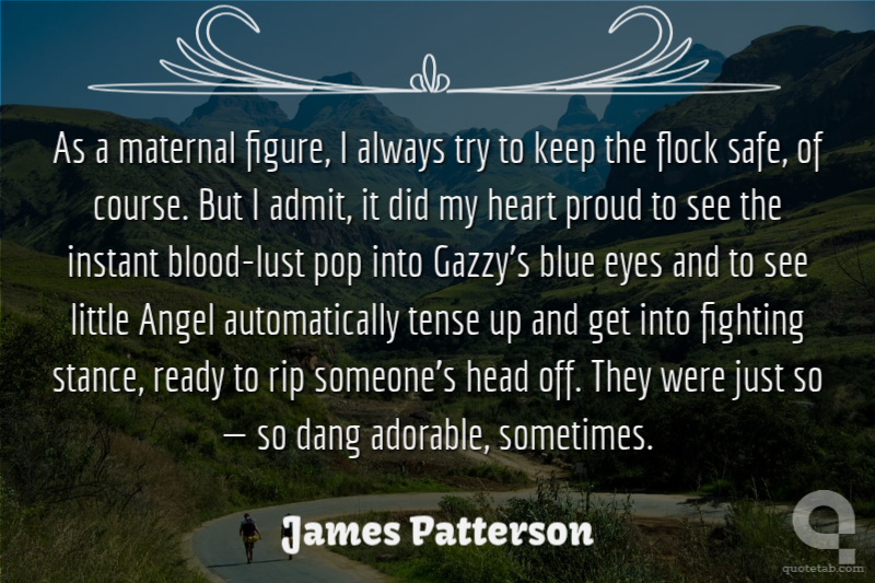 As a maternal figure, I always try to keep the flock safe, of course. But I admit, it did my heart proud to see the instant blood-lust pop into Gazzy’s blue eyes and to see little Angel automatically tense up and get into fighting stance, ready to rip someone’s head off. They were just so — so dang adorable, sometimes.