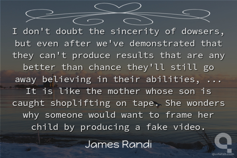 I don't doubt the sincerity of dowsers, but even after we've demonstrated that they can't produce results that are any better than chance they'll still go away believing in their abilities, ... It is like the mother whose son is caught shoplifting on tape. She wonders why someone would want to frame her child by producing a fake video.