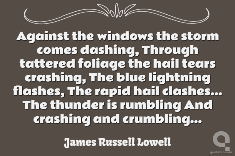 Against the windows the storm comes dashing, Through tattered foliage the hail tears crashing, The blue lightning flashes, The rapid hail clashes... The thunder is rumbling And crashing and crumbling...