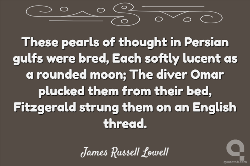 These pearls of thought in Persian gulfs were bred, Each softly lucent as a rounded moon; The diver Omar plucked them from their bed, Fitzgerald strung them on an English thread.
