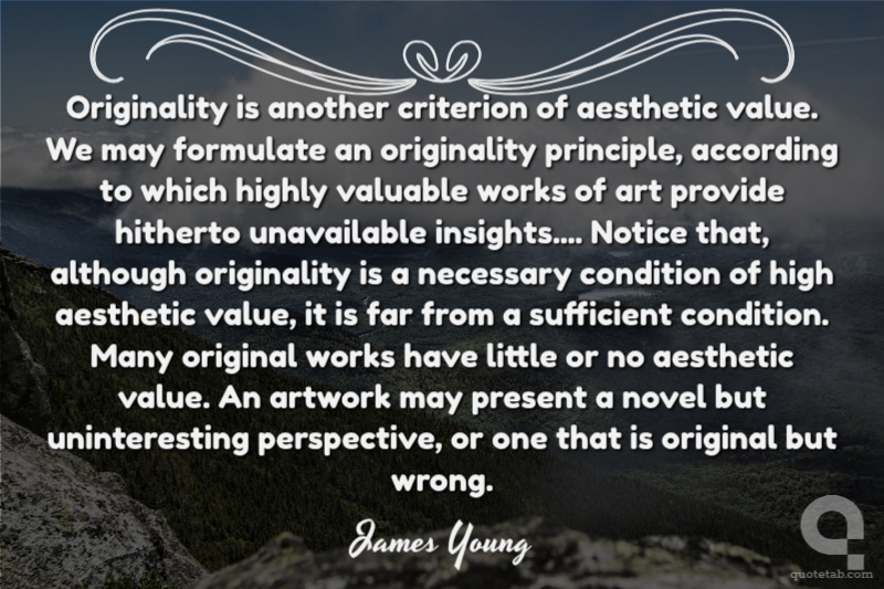 Originality is another criterion of aesthetic value. We may formulate an originality principle, according to which highly valuable works of art provide hitherto unavailable insights.... Notice that, although originality is a necessary condition of high aesthetic value, it is far from a sufficient condition. Many original works have little or no aesthetic value. An artwork may present a novel but uninteresting perspective, or one that is original but wrong.
