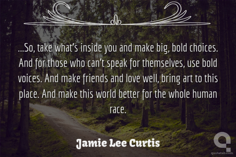 ...So, take what's inside you and make big, bold choices. And for those who can't speak for themselves, use bold voices. And make friends and love well, bring art to this place. And make this world better for the whole human race.