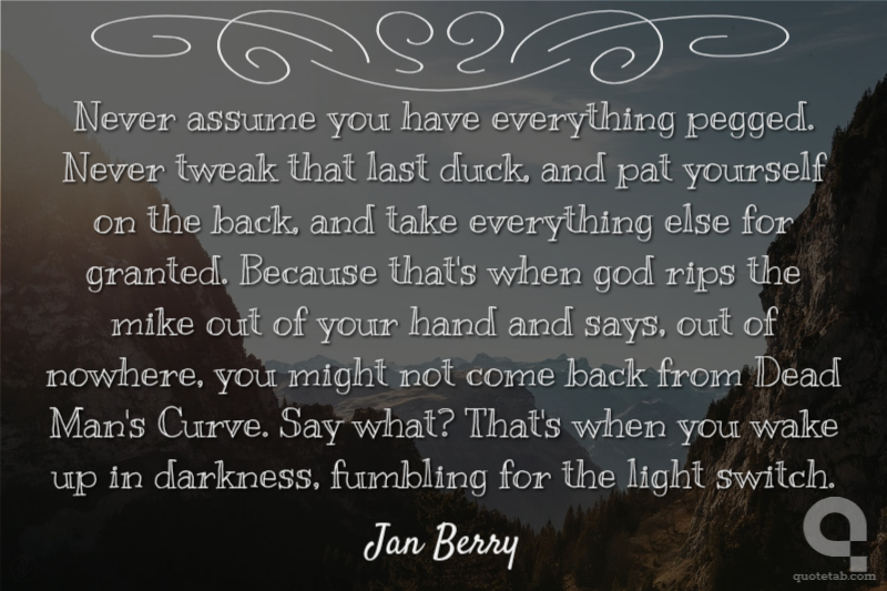 Never assume you have everything pegged. Never tweak that last duck, and pat yourself on the back, and take everything else for granted. Because that's when god rips the mike out of your hand and says, out of nowhere, you might not come back from Dead Man's Curve. Say what? That's when you wake up in darkness, fumbling for the light switch.